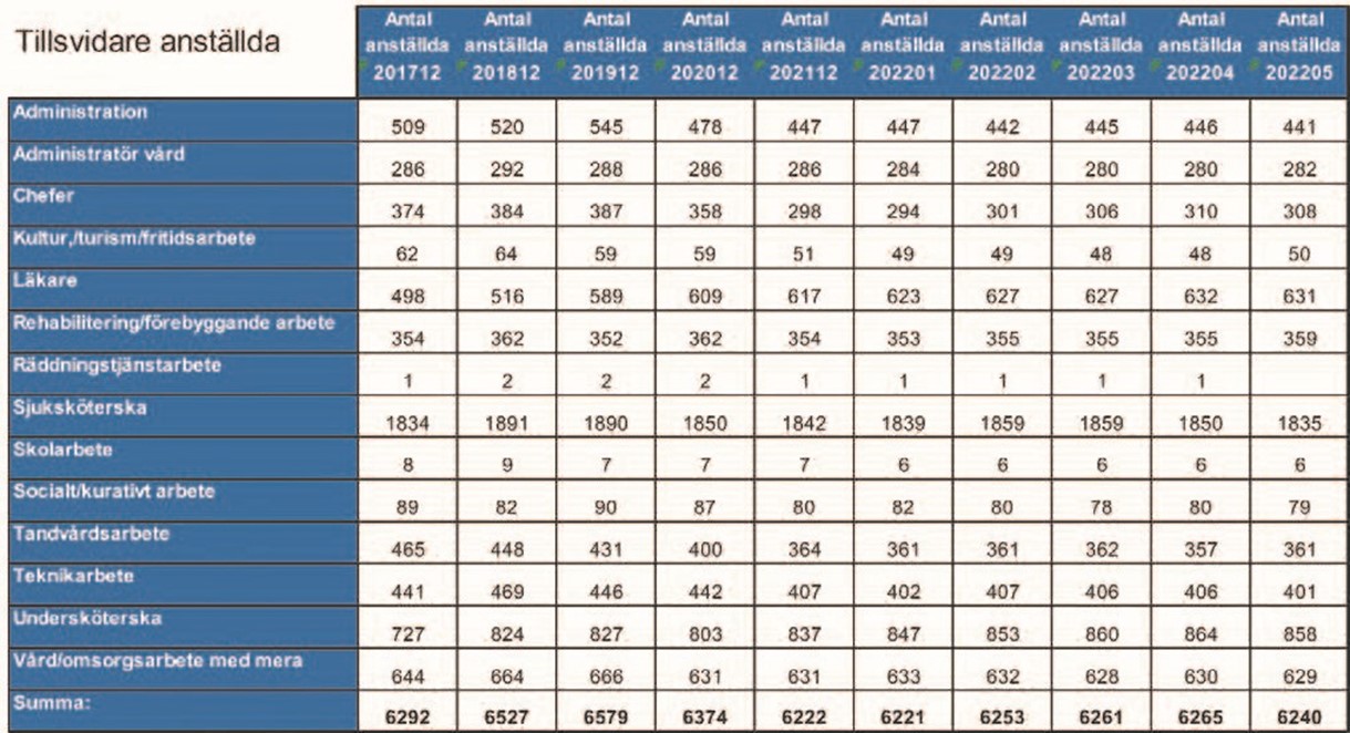 Region Norrbotten har lika många tillsvidareanställda sjuksköterskor nu som 2017, men fler undersköterskor och läkare. Vi har uppfyllt vallöftet om att dra ner på administrativ och övrig personal, för att kunna satsa på sjukvården.