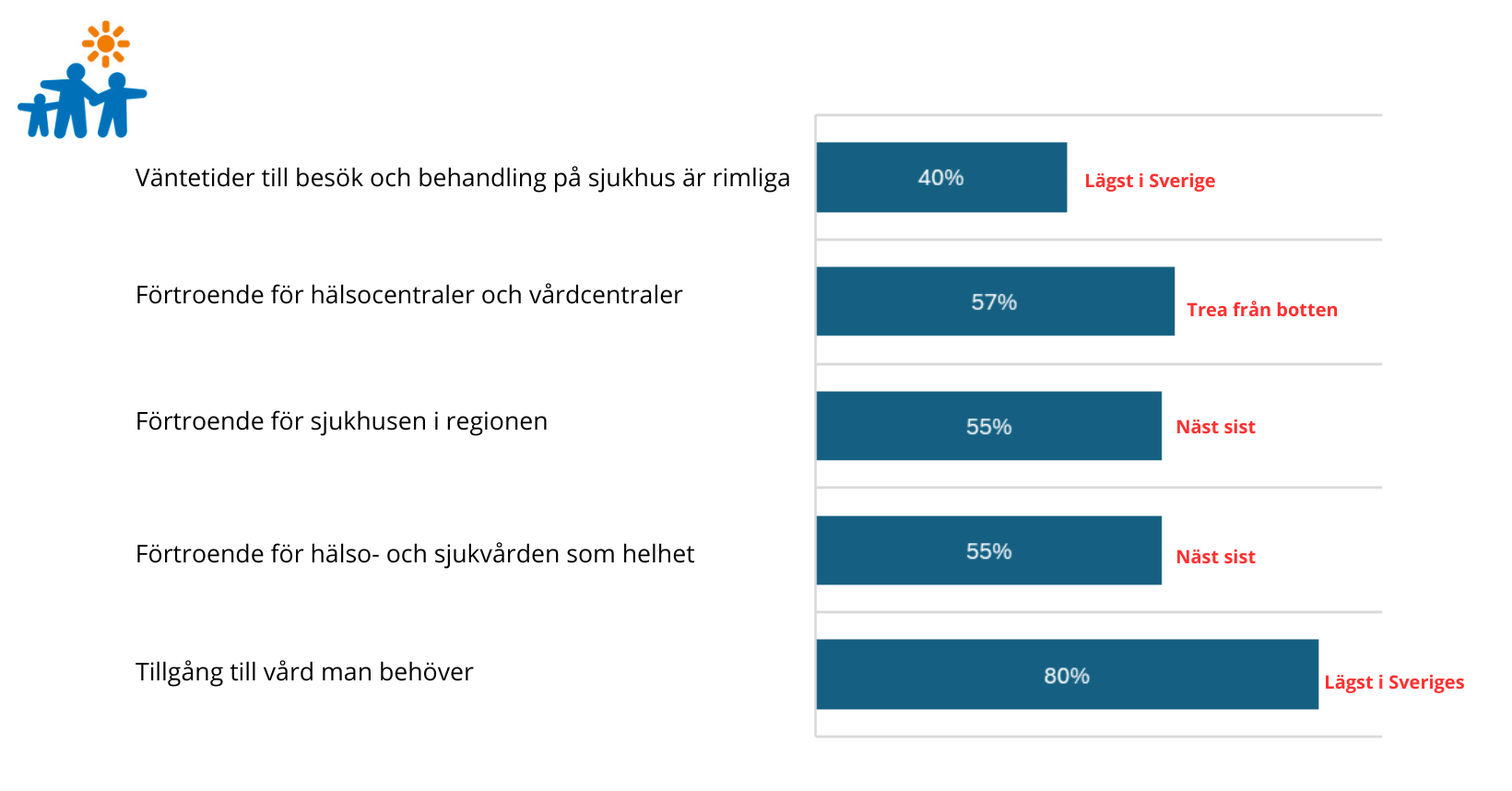 Enligt SKR:s senaste Hälso- och sjukvårdsbarometer 2024 är vi sämst i landet när det gäller tillgång till vård, förtroende för sjukvården och rimliga väntetider.